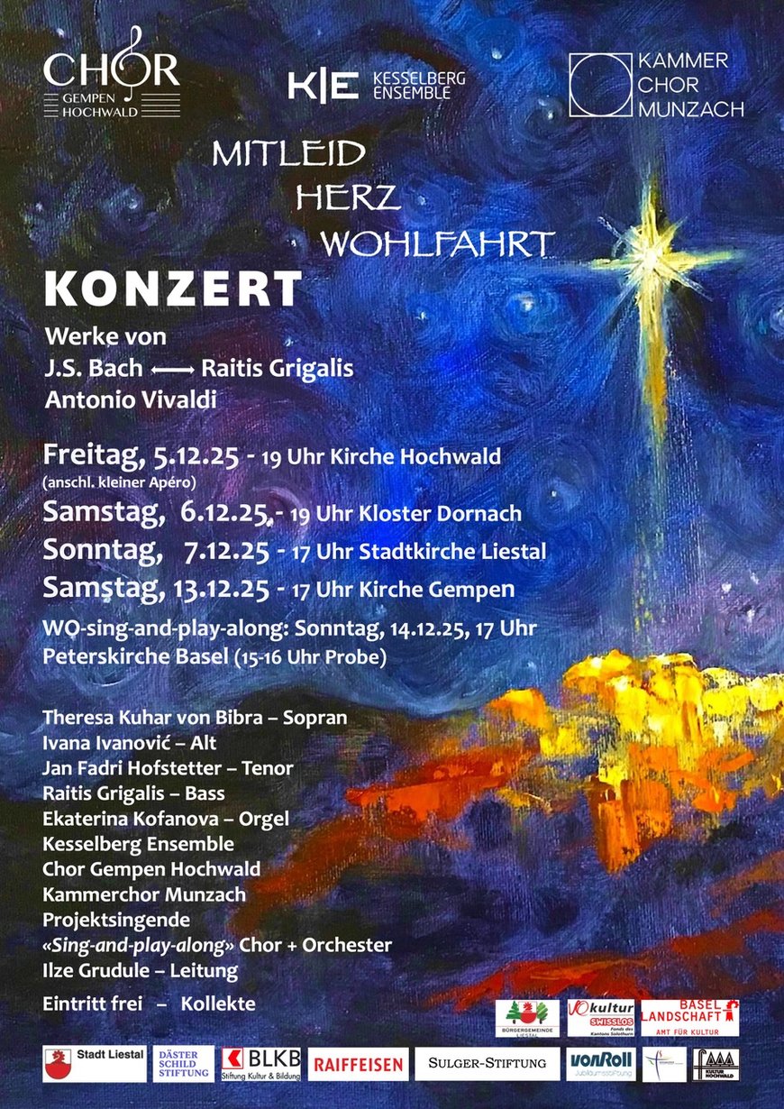 Auch diese Jahr werden wir, unter der Leitung unserer Dirigentin Ilze Grudule, gemeinsam mit dem Chor Gempen Hochwald, 4 Solist*innen und dem Kesselberg Ensemble, ein grosses Adventsprojekt starten.